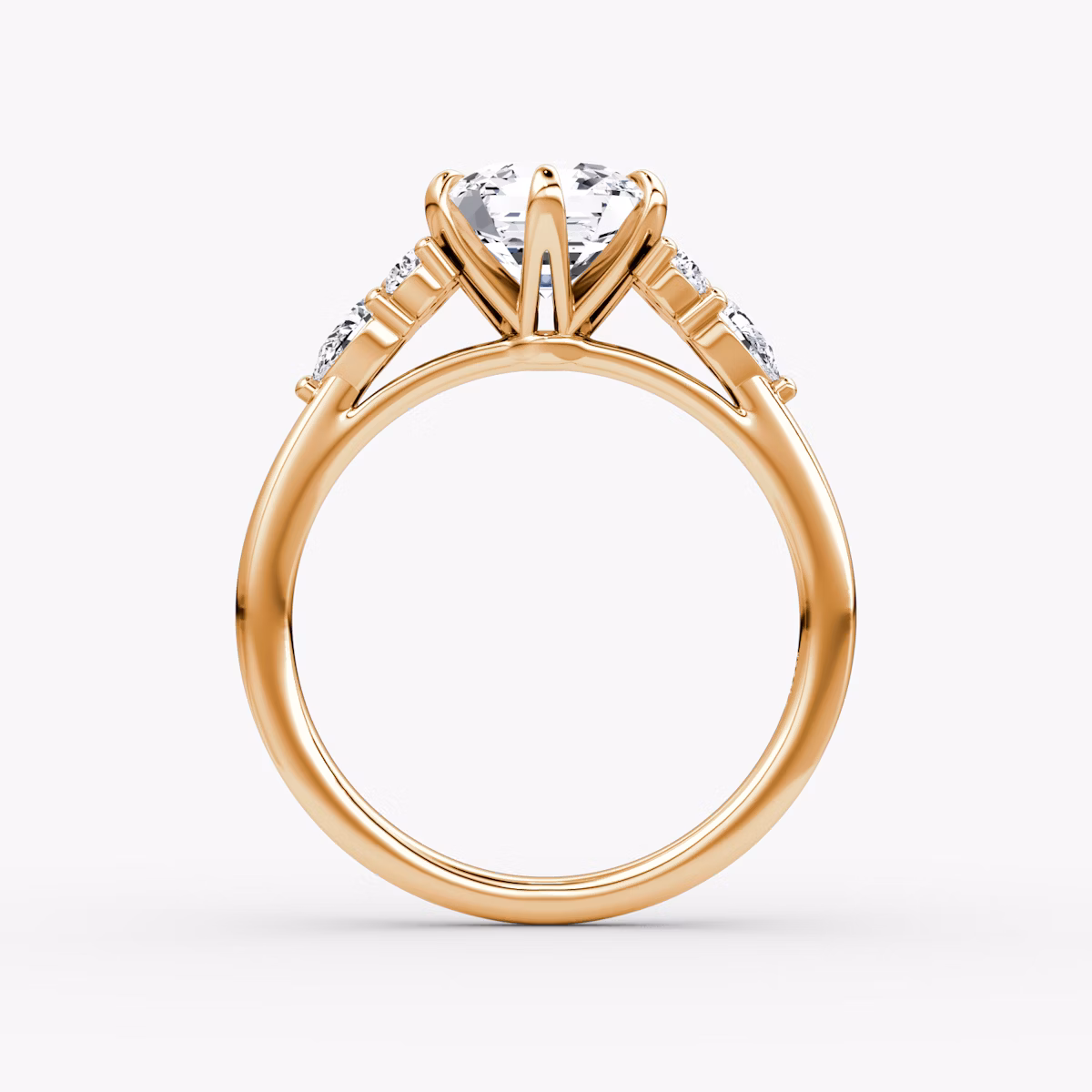 A cluster of Pear and Round Brilliant side stones enhance your VRAI created diamond of choice from either side in this vintage-inspired design. This scintillating take on a Cathedral setting features graceful arches that lift your center stone to catch the light, while v-shaped prongs secure it into place.