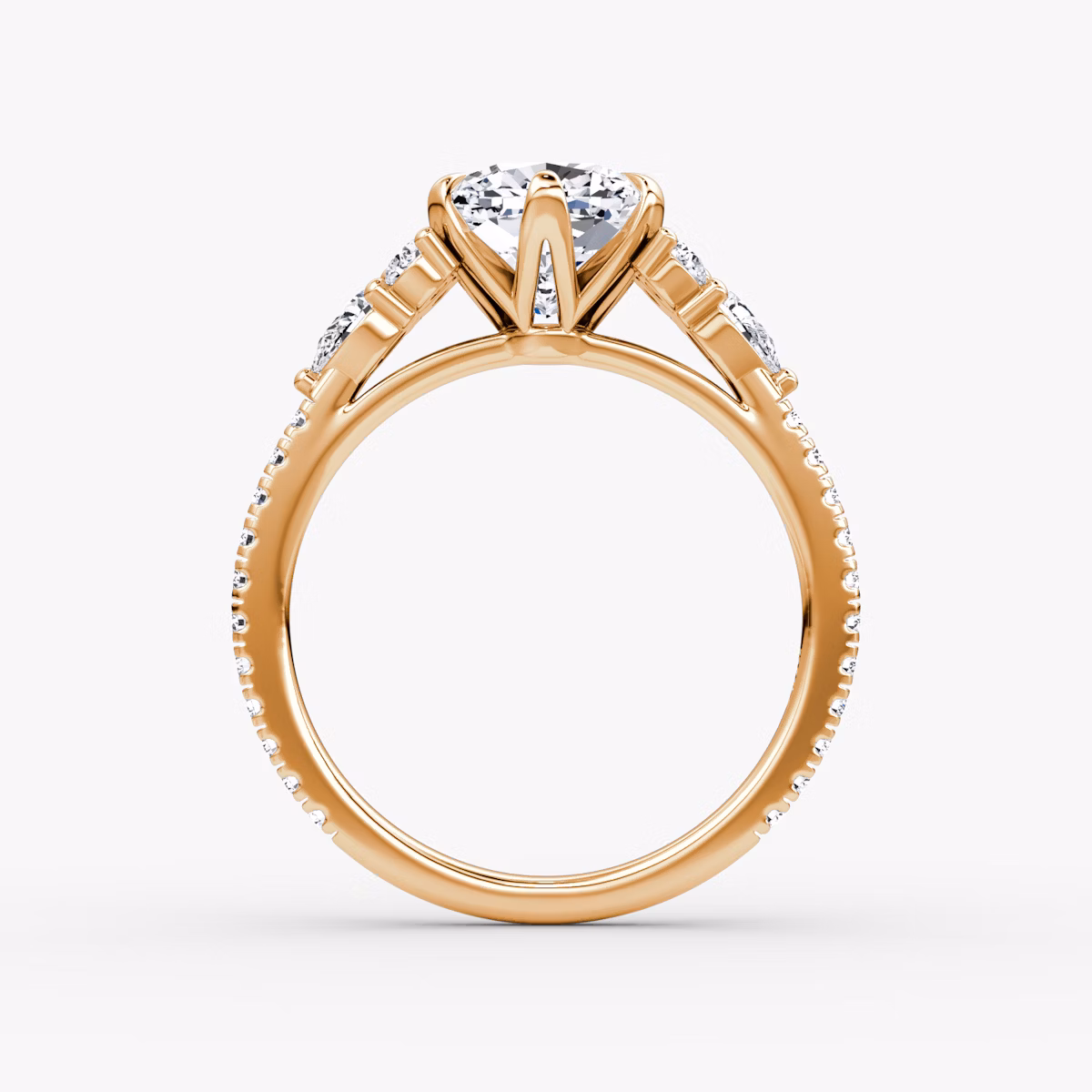 A cluster of Pear and Round Brilliant side stones enhance your VRAI created diamond of choice from either side in this vintage-inspired design. This scintillating take on a Cathedral setting features graceful arches that lift your center stone to catch the light, while v-shaped prongs secure it into place.