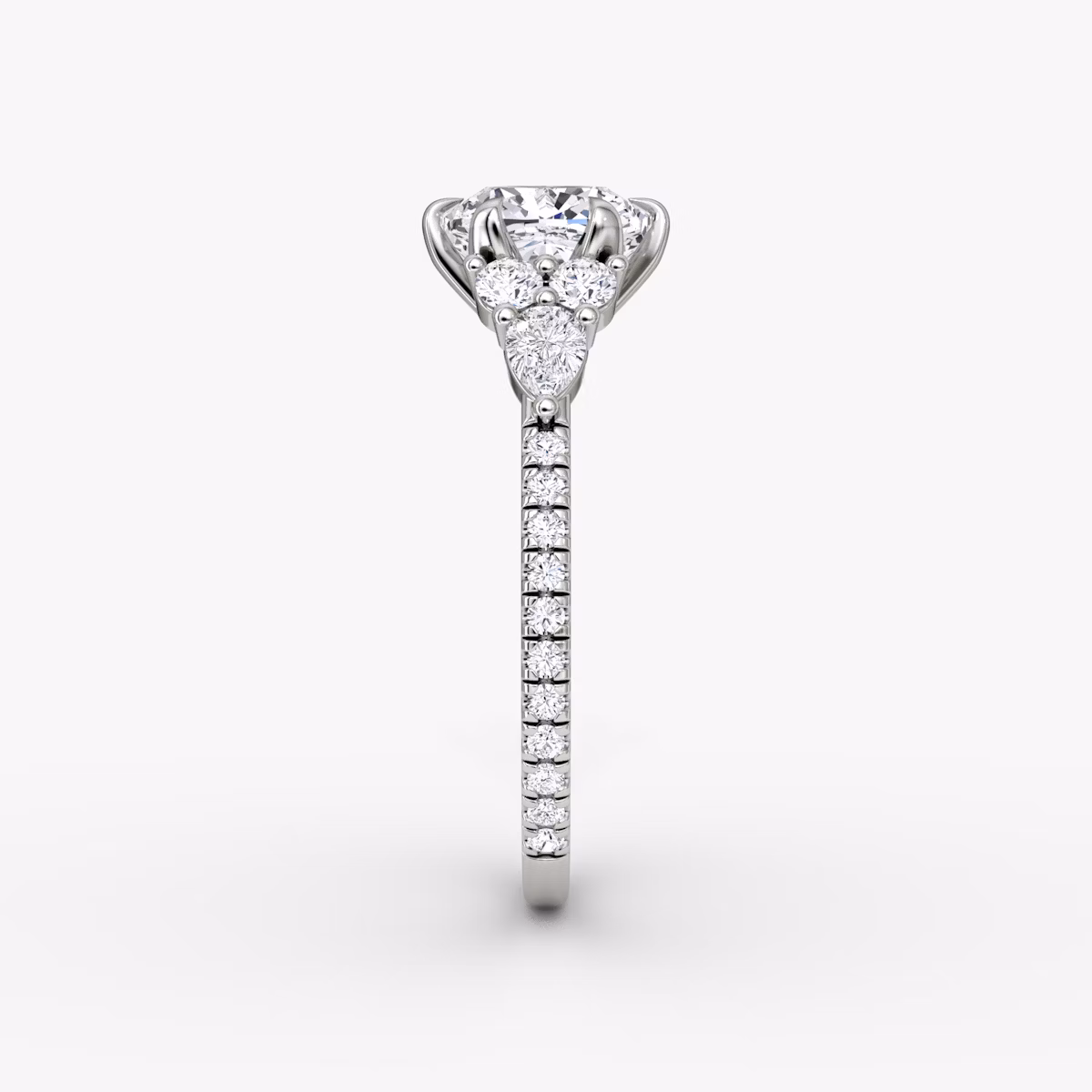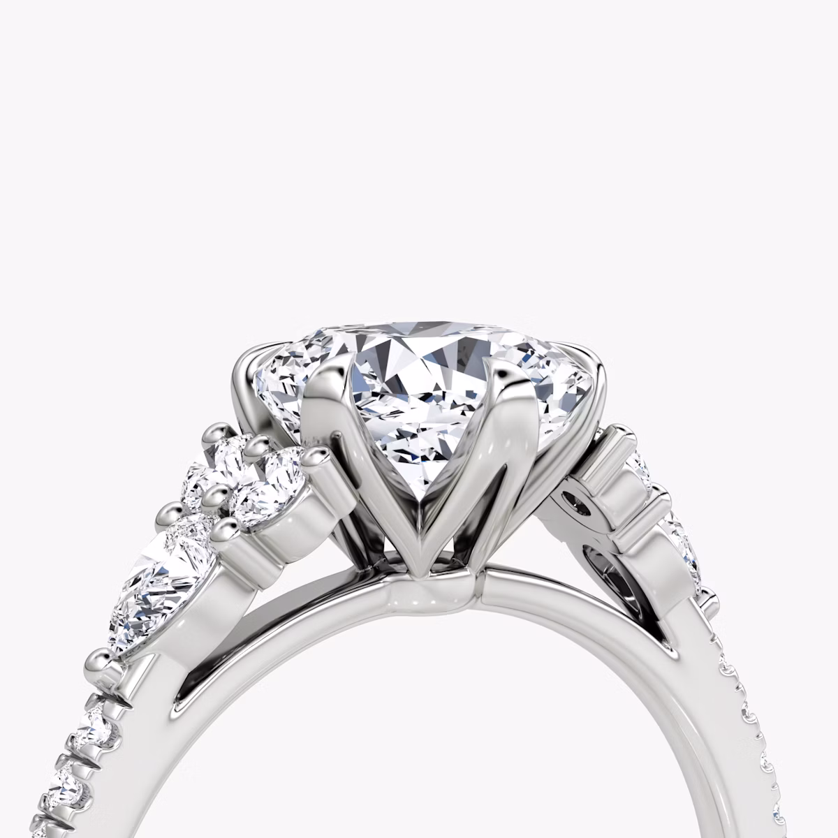 A cluster of Pear and Round Brilliant side stones enhance your VRAI created diamond of choice from either side in this vintage-inspired design. This scintillating take on a Cathedral setting features graceful arches that lift your center stone to catch the light, while v-shaped prongs secure it into place.