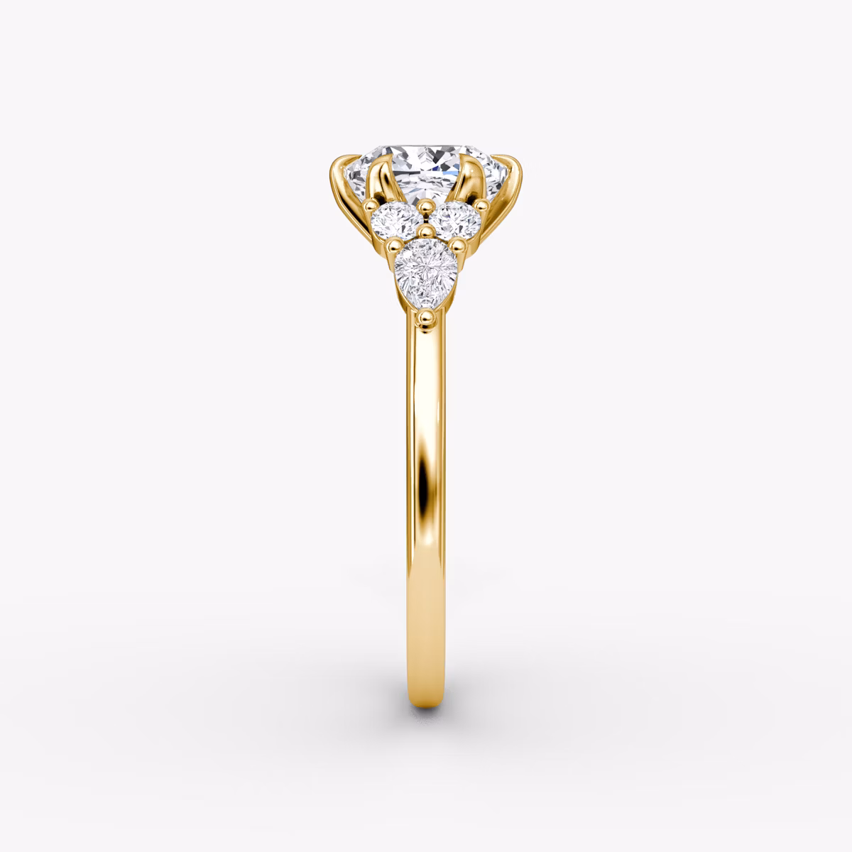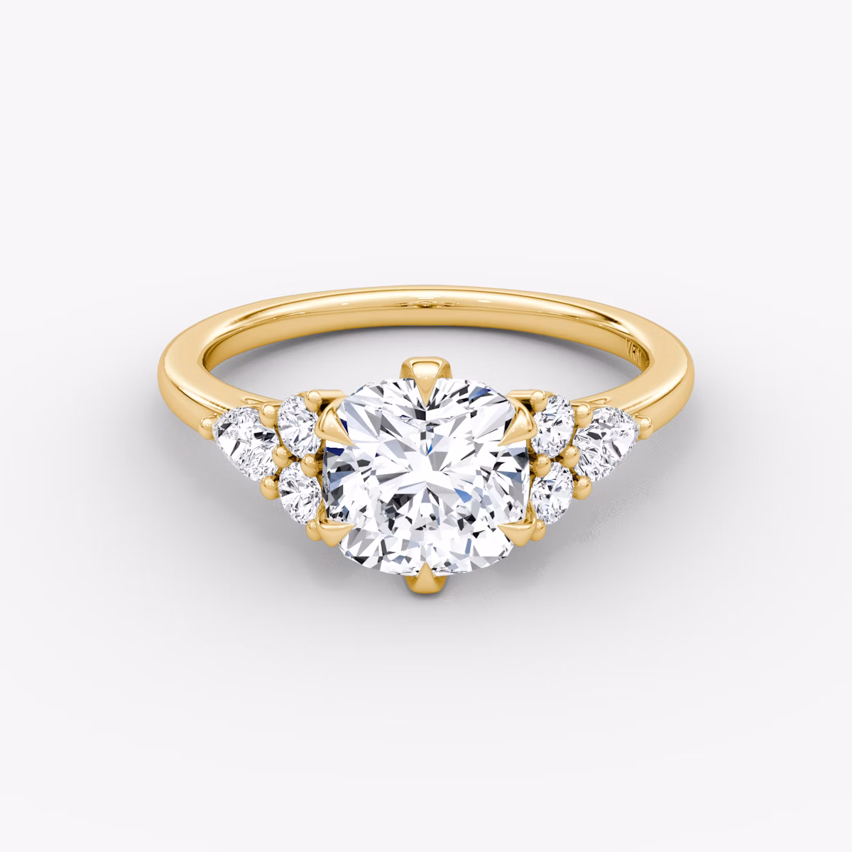 The Pear Cluster Heirloom solitaire in 18k yellow gold with a cushion diamond