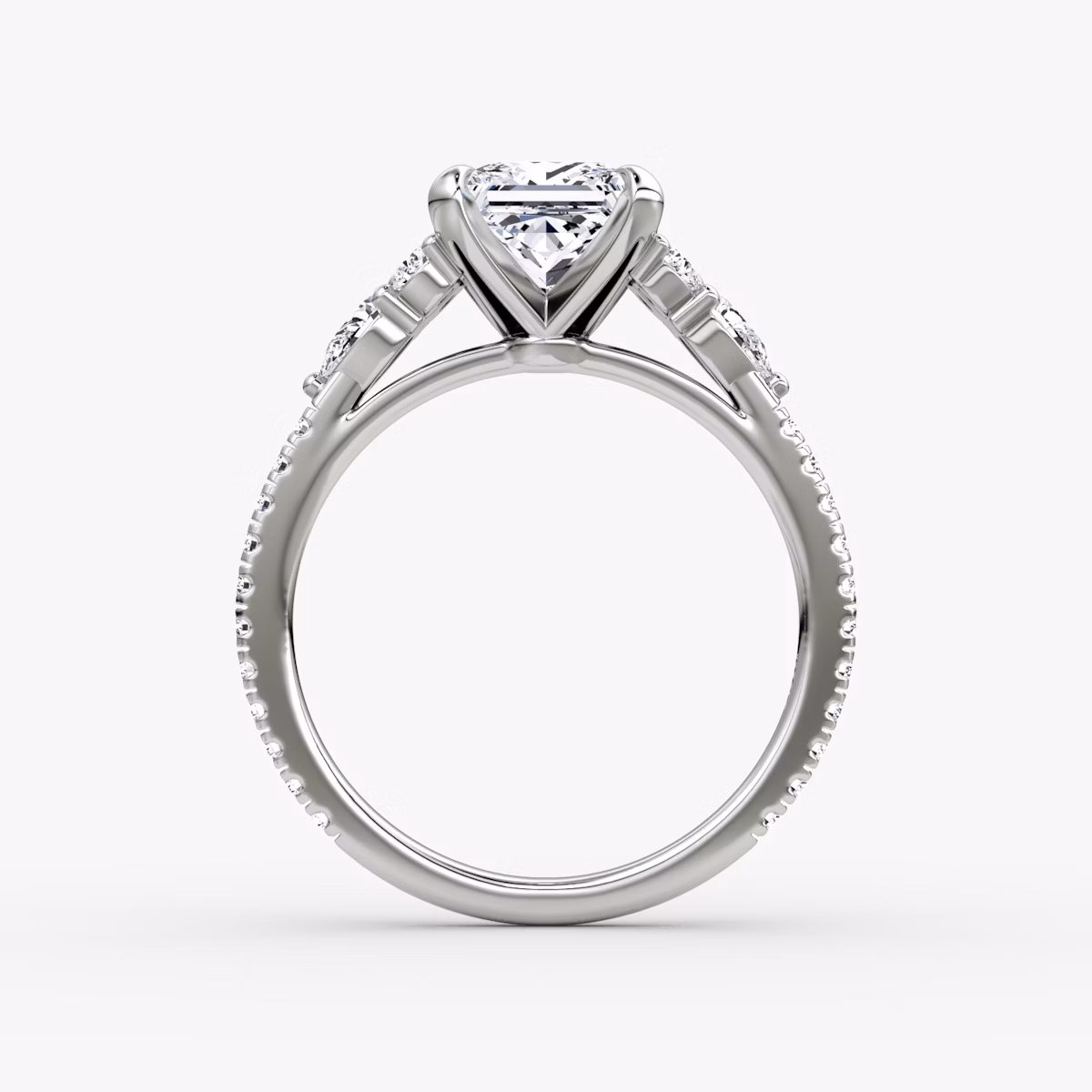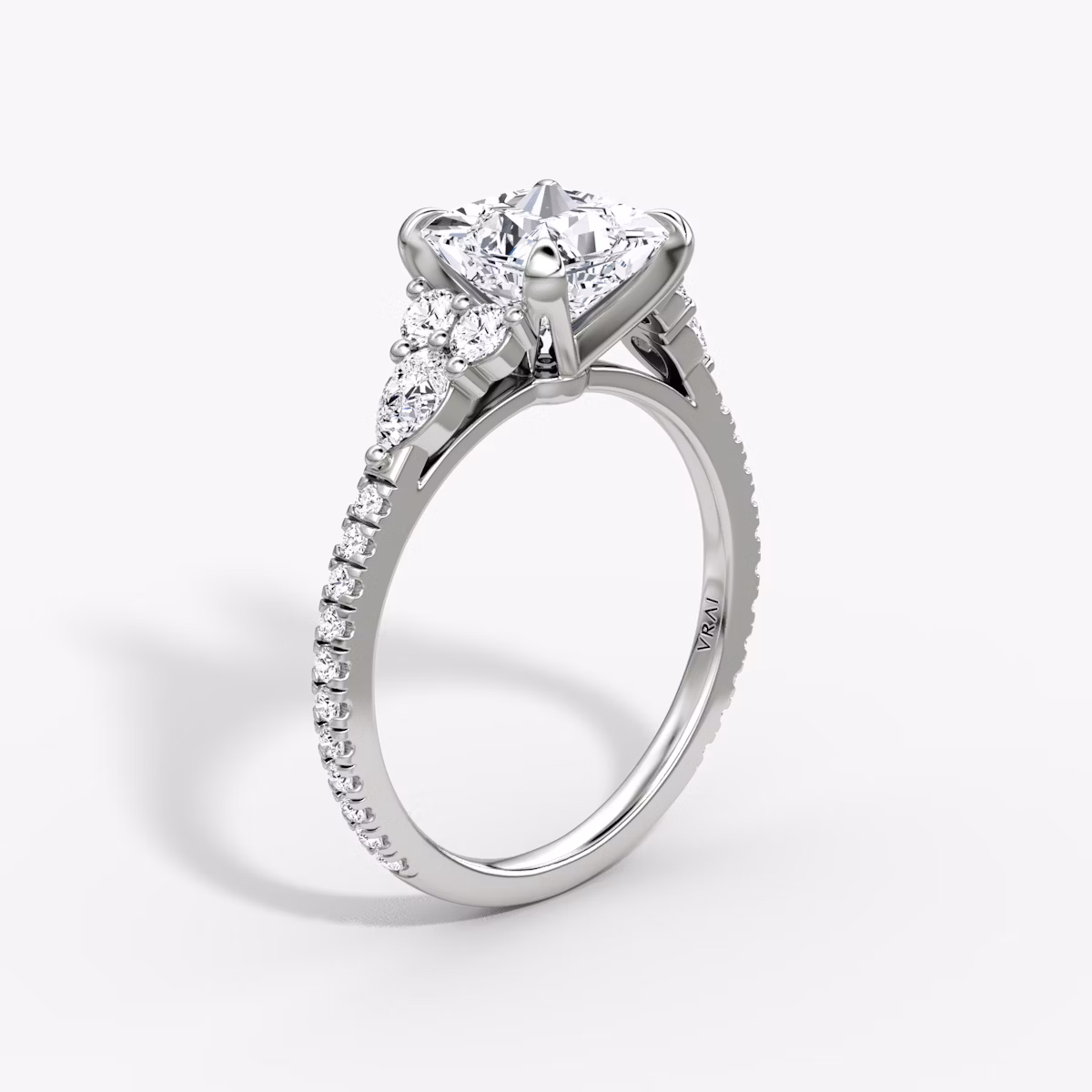 A cluster of Pear and Round Brilliant side stones enhance your VRAI created diamond of choice from either side in this vintage-inspired design. This scintillating take on a Cathedral setting features graceful arches that lift your center stone to catch the light, while v-shaped prongs secure it into place.