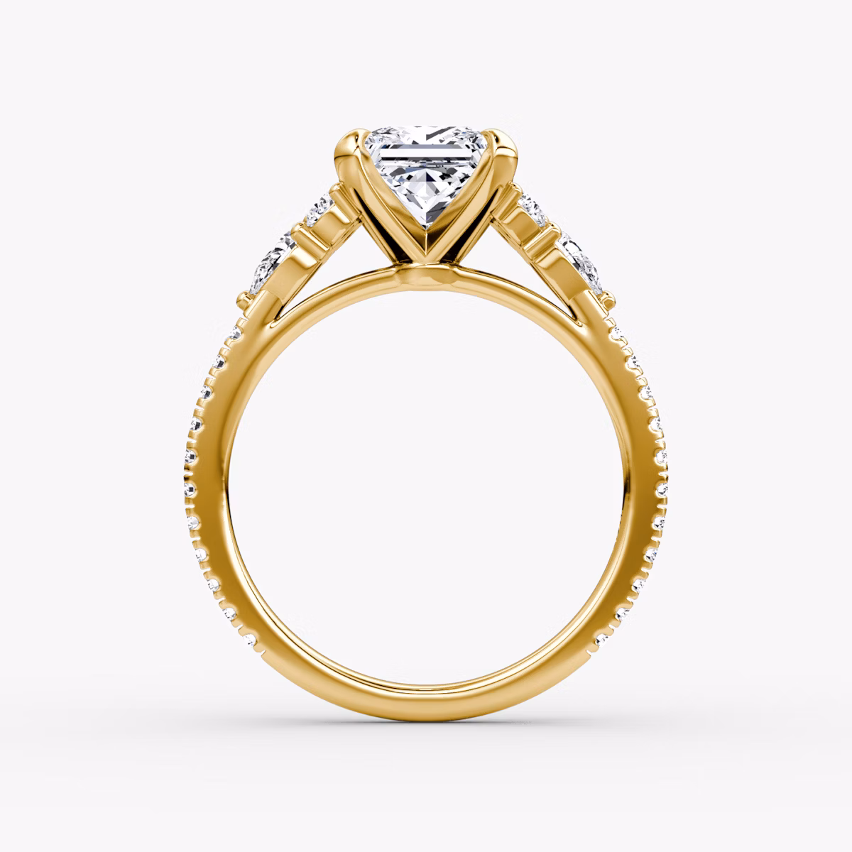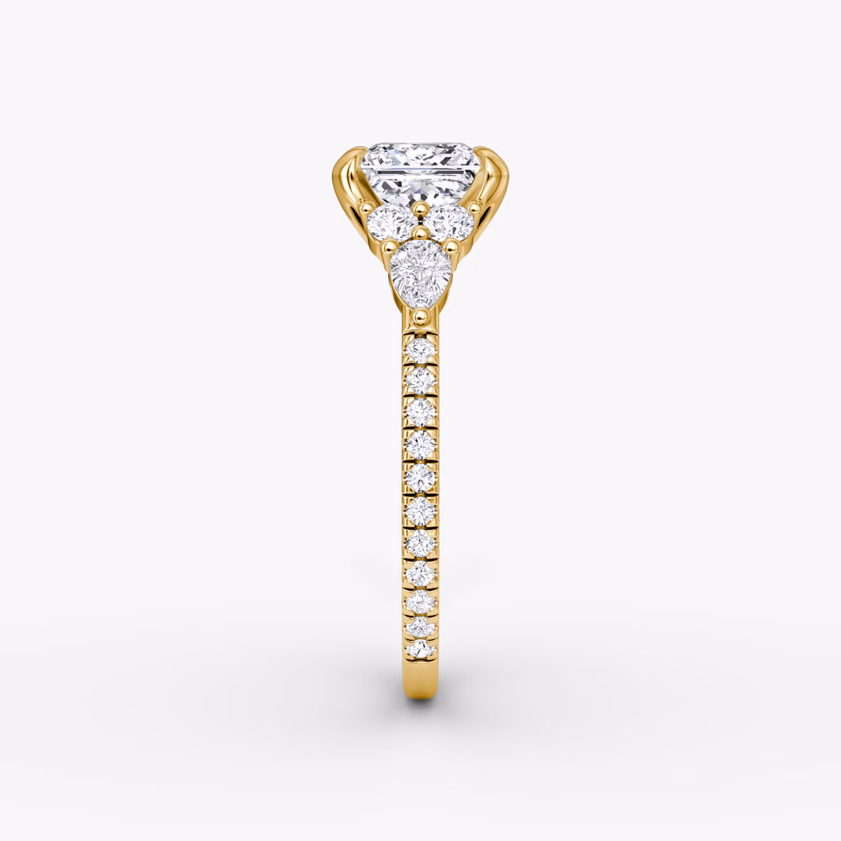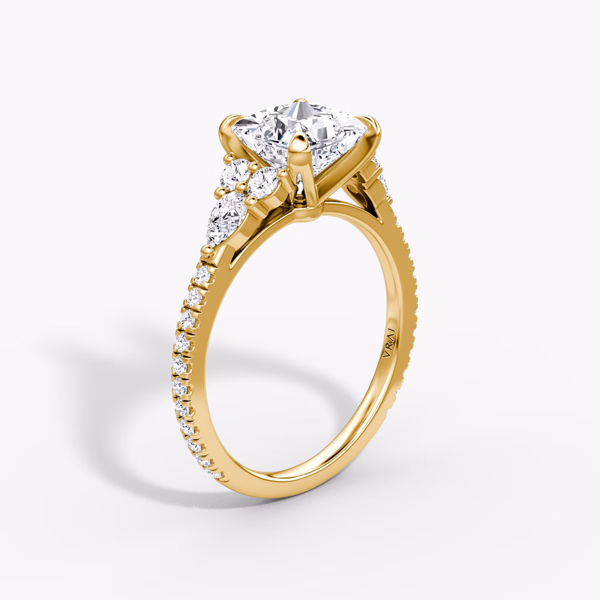 The Pear Cluster Heirloom solitaire in 18k yellow gold with a princess diamond