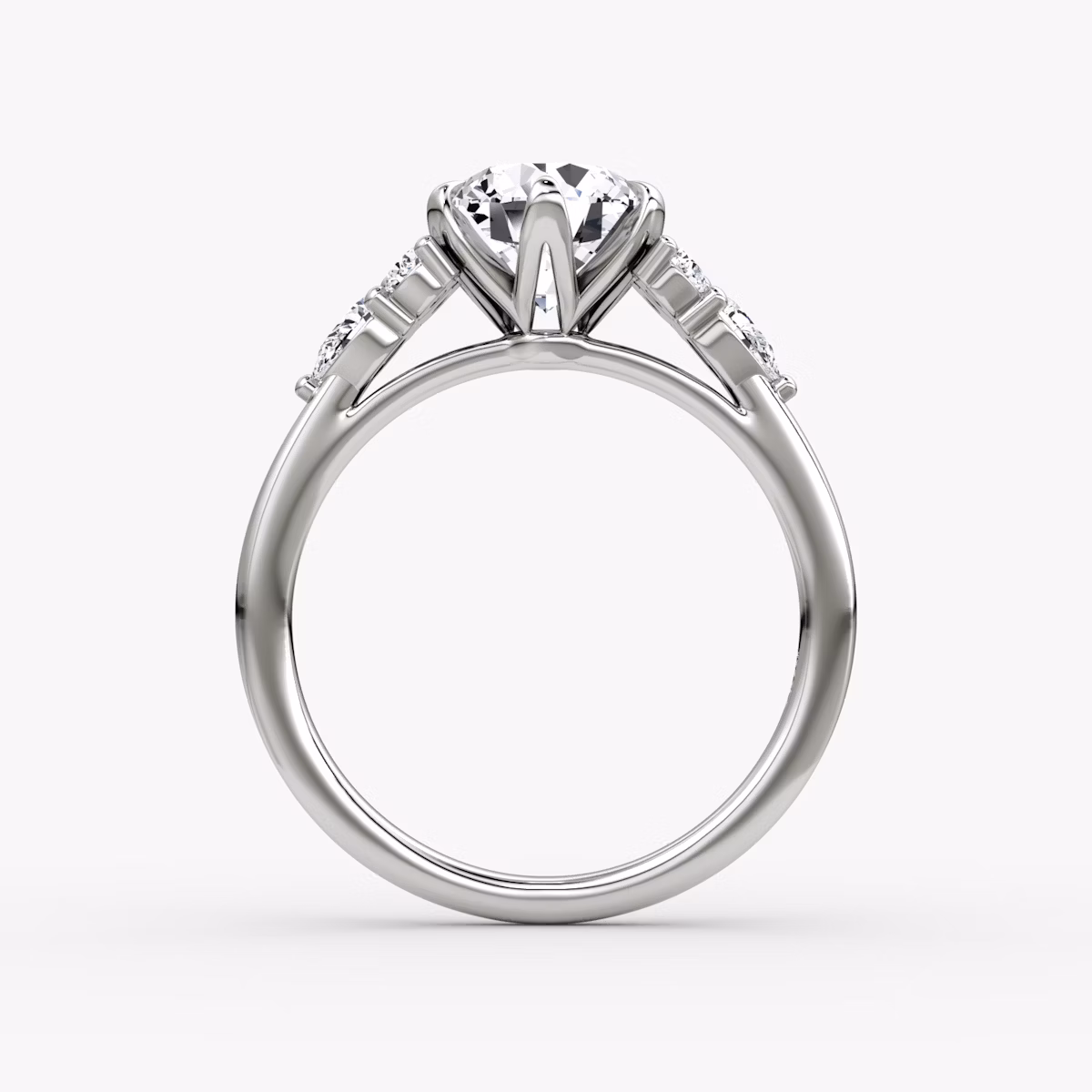 A cluster of Pear and Round Brilliant side stones enhance your VRAI created diamond of choice from either side in this vintage-inspired design. This scintillating take on a Cathedral setting features graceful arches that lift your center stone to catch the light, while v-shaped prongs secure it into place.