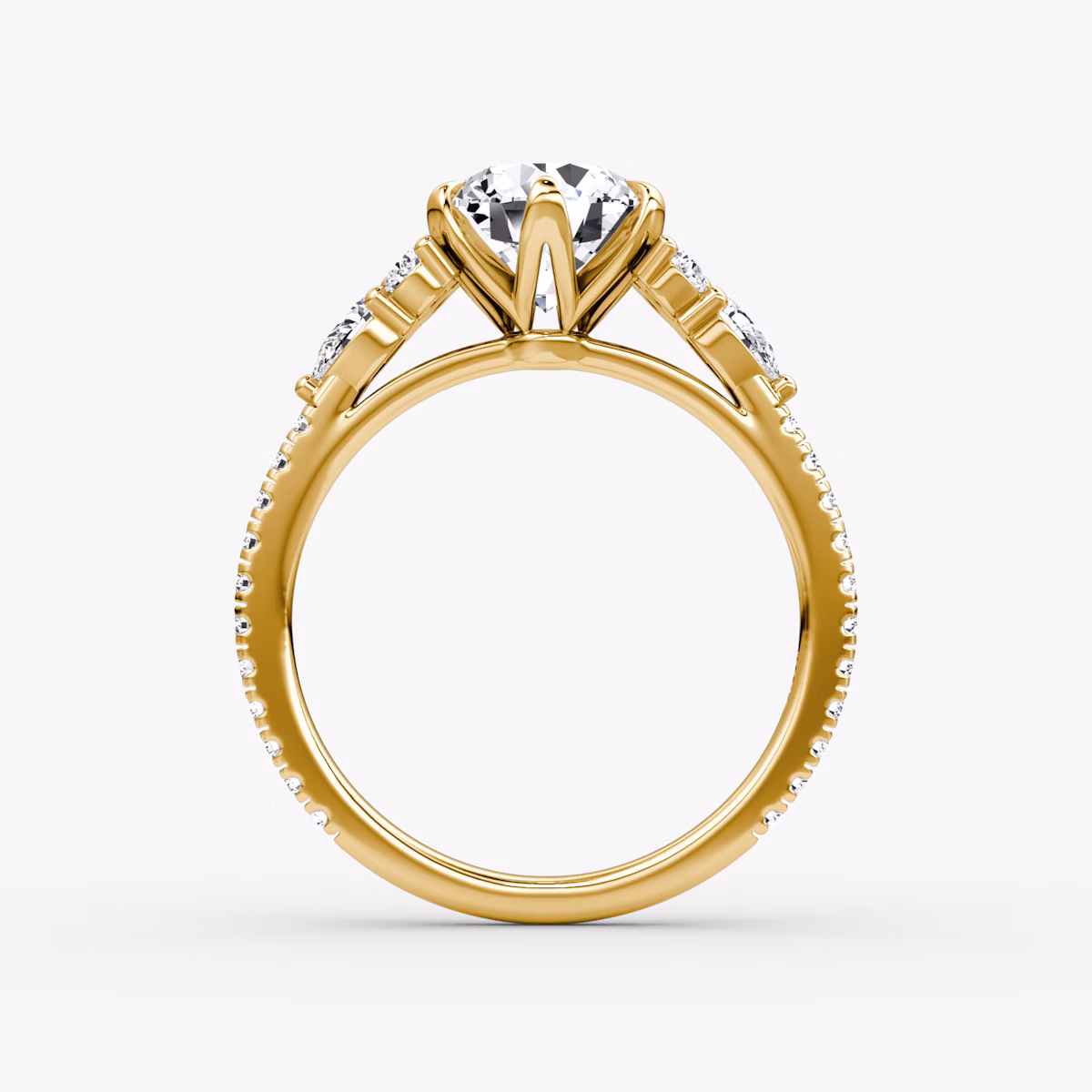 A cluster of Pear and Round Brilliant side stones enhance your VRAI created diamond of choice from either side in this vintage-inspired design. This scintillating take on a Cathedral setting features graceful arches that lift your center stone to catch the light, while v-shaped prongs secure it into place.